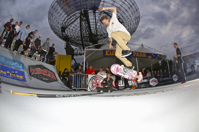 Nach der kurzen Skateeinlage meinerseits hiess es wieder die Kamera auspacken und mit dem Photographieren der A-Gruppe zu starten. Jetzt wurde es hektisch. „Too many MC´s not enough Mics“ wäre wohl die treffendste Umschreibung, für das, was auf dem Parcours nun stattfand. Justin Sommer war der erste Leidtragende, der erst ein Board ins Knie bekam und später einfach nur umgefahren wurde. Er konnte einem wirklich leidtun, aber was ein Jungspund wie Justin ist, der steckt so was auch schon mal weg, scheinbar, irgendwie. Die Meisten hatten dann auch wohl begriffen, schon an diesem Samstag ausnahmsweise Vollgas zu geben, besonders Alex Mizurov, der einen absoluten flawless Run fuhr. Auch Tom Kleinschmidt meldetet sich eindrucksvoll zurück und kam so auf den zweiten Platz. Man muss sich hier immer wieder ins Gedächtnis rufen, das in diesem Jahr nicht „gesammelte Punkte“, sondern der finale Event den Sieger macht. Heißt also, wenn Alex nicht gewonnen hätte, hätte auch jeder andere Sieger von Rust den Lexus für ein Jahr bekommen!
