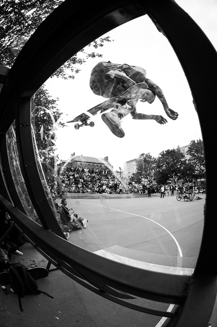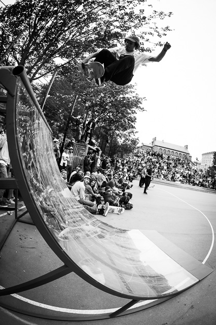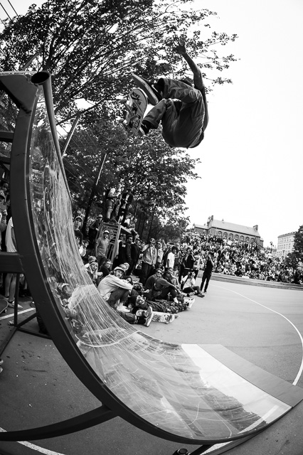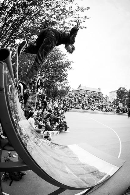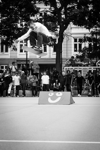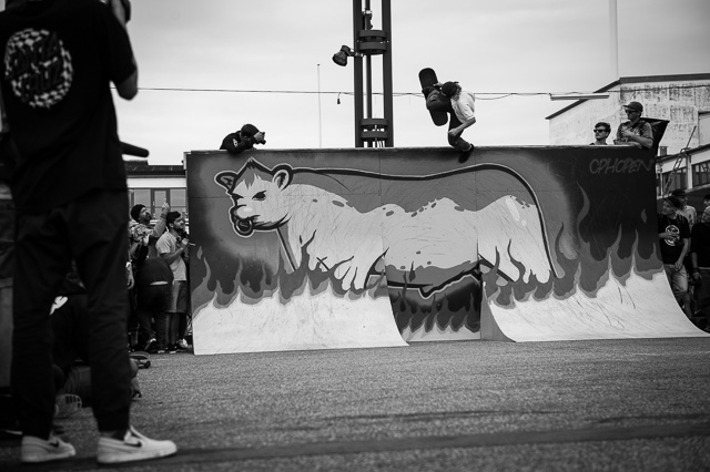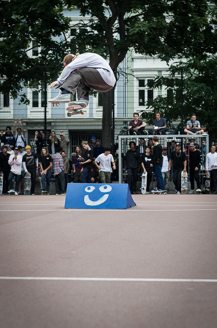 Im selbigen Areal stand auch bereits nach Ankunft der Menschenmassen eine, ich sag mal „normal große“ Quarter-Pipe, die allerdings zu bestimmt 1/3 aus einer Vertikalen bestand, welche den Schwierigkeitsgrad immens erhöhte und dabei selbst Rock to fakies oder Rock’n’Rolls auf Applaus stießen. Independent eben – kein Kindergarten hier mit dem Wallride!