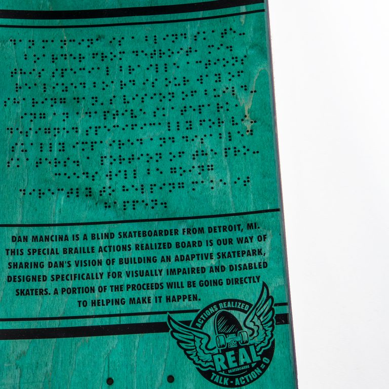 Yeah, for sure. Lot of skaters. Especially when I’m like in The D. When I’m down in Detroit, I’ll get, “Dan The Man!”, quite a bit. Skateboarding’s a tight-knit culture and shit. “Dude! I saw you on Thrasher! Fucking sick.” Signing my signature is a weird thing. Dude, I almost forgot! This lady hit me up who works for the Smithsonian and the National or the American History museum for the Smithsonian. They wanna include a braille deck in the adaptive sports collection. At the fucking Smithsonian. I’ll have like one of my old skate canes in there and like one of my first Real boards I got for my first box where I started putting the little rolled up sticker with the grip tape.