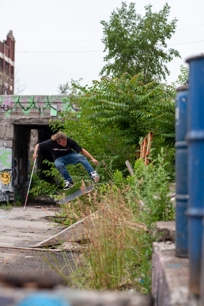 Man, I don’t know. For whatever reason I just started thinking about it again, and I was filming all these Instagram videos of me doing random shit to show people that just because I’m blind, I’m still like the same person. Playing darts, or ping pong, or something like that, beer pong, all these random videos. And then I was like, you know, I always love skating, it’s the best. So like I just built a little bench, and tried to do a front board on the bench, and that was pretty much the spark that reignited the passion or the flame or whatever. It just slowly grew from there. And I didn’t even jump right back into it, just slowly started skating more and more. It was pretty hard, because none of the friends that I hang out with skated anymore. They used to but they’re not motivated to go skate or anything. But then I kind of got aligned with a younger generation. It just motivated me to really get back out like in the streets, and just remember how much I love it, how rad it is, finding spots, and figuring out what I can do is the best.
