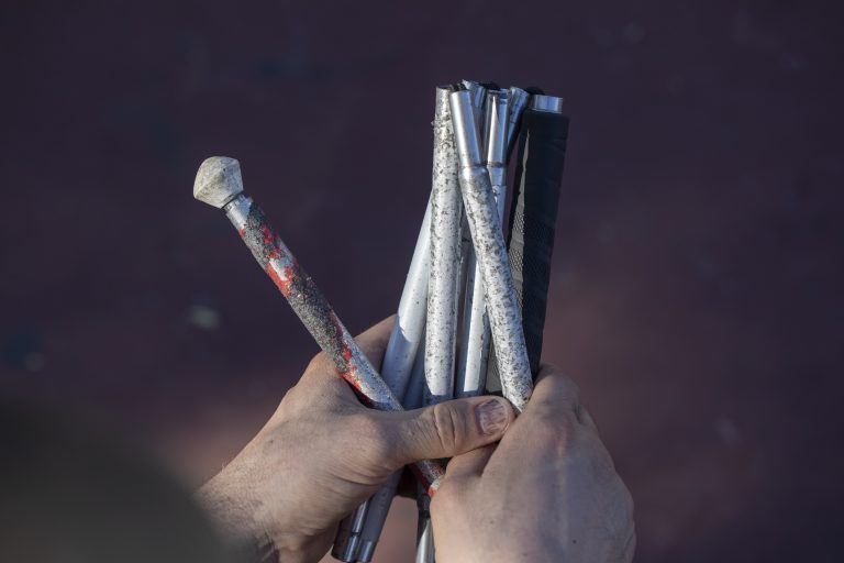 Yeah it’s always cracks, but any object like a trash can, a pillar, somewhere to start from or to give me orientation. Cracks are huge to help guide me. What else? Sound, even like just help with orientation, if there’s a street on the right when I’m standing towards the obstacle, I can hear it on my right side or something like that. A weird sound, a buzzing of a light, or it could be anything, you know? Or my friend Steve who films with me. I can always find him, hit him with my cane. There’s been multiple times where I’m like looking for something, and he’s like “Dude. Dude, you hit me right in the head.”