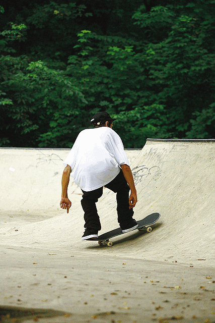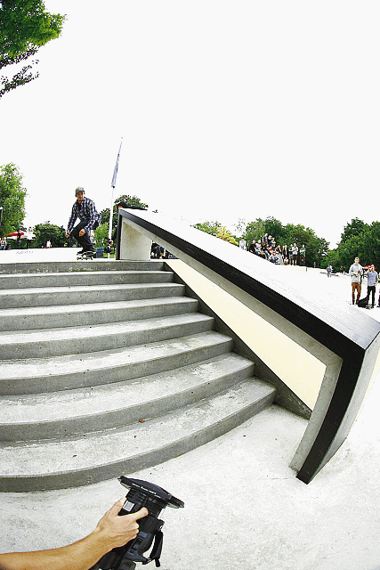 Auch die Demo an der North Brigade war sehr gut besucht, und DJ Ortsiefer ist sicher ein Stein vom Herzen gefallen, daß die „North-Wolke“ an diesem Tag ausnahmsweise den Platz verschonte. Tommy Sandoval schockte die Zuschauer schon nach wenigen Minuten mit einem Fs Flip von „ganz oben“, bevor er und Ryan Decenzo das Rail und die Stufen auseinander nahmen. DJ war begeistert von der Professionalität, mit der die Jungs den Park auseinander nahmen und sah sich bestätigt, die gute alte Holz-Miniramp stehen gelassen zu haben – in der sich nun Chris Haslam austobte. Die Demo ging etwa zwei Stunden, und als Alle eigentlich schon ausgepowert waren, bestiegen wir wieder die beiden Fahrzeuge und… gingen Streetskaten.