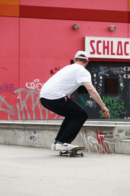 Frankfurt kam in meinen Kopf, aber der Gedanke mit zwei großen Autos im Umfeld der Hauptwache nach einem Parkplatz suchen zu müssen, ließ mich schnell von der Idee abweichen. Gleiches galt für Stuttgart; wenn man alleine eine Stunde für das hinein und herausfahren aus der Stadt benötigt, ist dies nicht nur nervig, sondern bedeutet auch, das man NOCH später am Zielort Ravensburg ankommen würde. Schnell kam mir in diesem Moment Wiesbaden in den Kopf. Zwar ist die hessische Landeshauptstadt meine Wahlheimat und wirkt vielleicht daher für den Aussenstehenden wie „der Weg des geringsten Wiederstands“, aber sie machte einfach am meisten Sinn! Hier gibt es einen perfekten Curb-Spot und da die Jungs eh ein paar Ledge-Tricks filmen wollten, wurde dieser Plan einfach in die Tat umgesetzt.