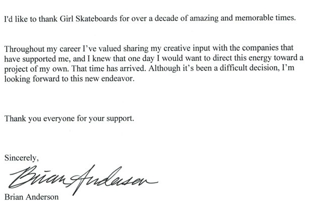 Diese Info hat bei uns ganz schön eingeschlagen! Der gefühlte Allzeit Girl Pro Brian Anderson wird die Company verlassen, um selbst ein Brand an den Start zu bringen. Wie das heisst, aussieht oder wer das dann letztendlich vertreibt ist noch nicht bekannt, wir werden euch aber auf dem Laufenden halten.