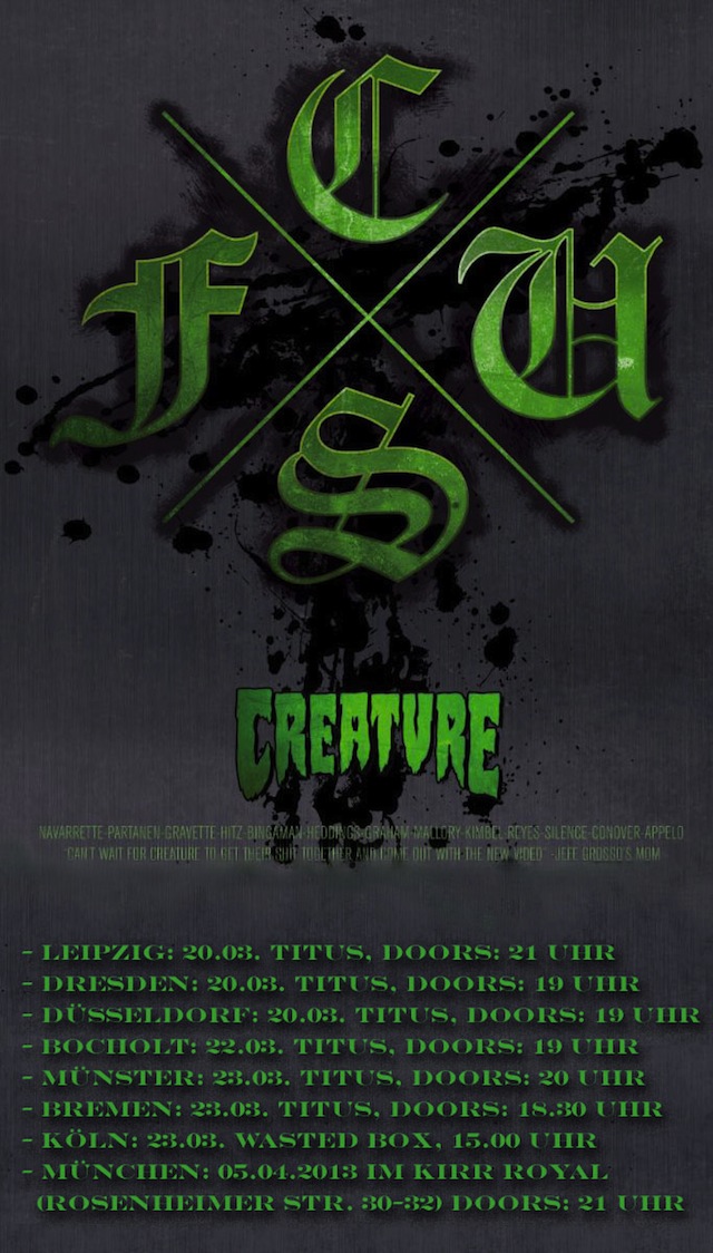 Das neue Creature Skateboards Video C.S.F.U. kommt mit großen Schritten näher ( in manchen Städten ist bereits morgen Premiere!) und wer eine der Deutschland Premieren besuchen will, kriegt hier schon mal die Termine: