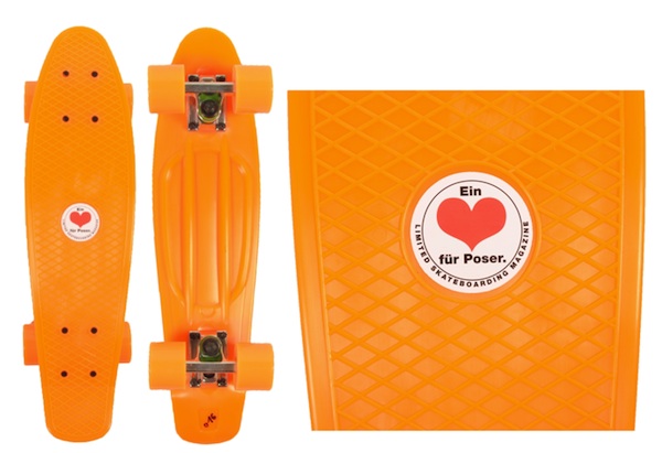 Wir schwimmen sowas von komplett mit auf der Plastikboard Revival Trendwelle und präsentieren euch das Modell: „Limited – Ein Herz für Poser“! Besser wird’s nicht, versprochen! Das Teil gibt es in den Farben blau, grün, orange und gelb in einem Skateshop eures Vertrauens, oder z.B. bei ing direct. Die 3/4 Hosen müsst ihr euch aber selbst krempeln, die sind im Preis nicht inbegriffen!