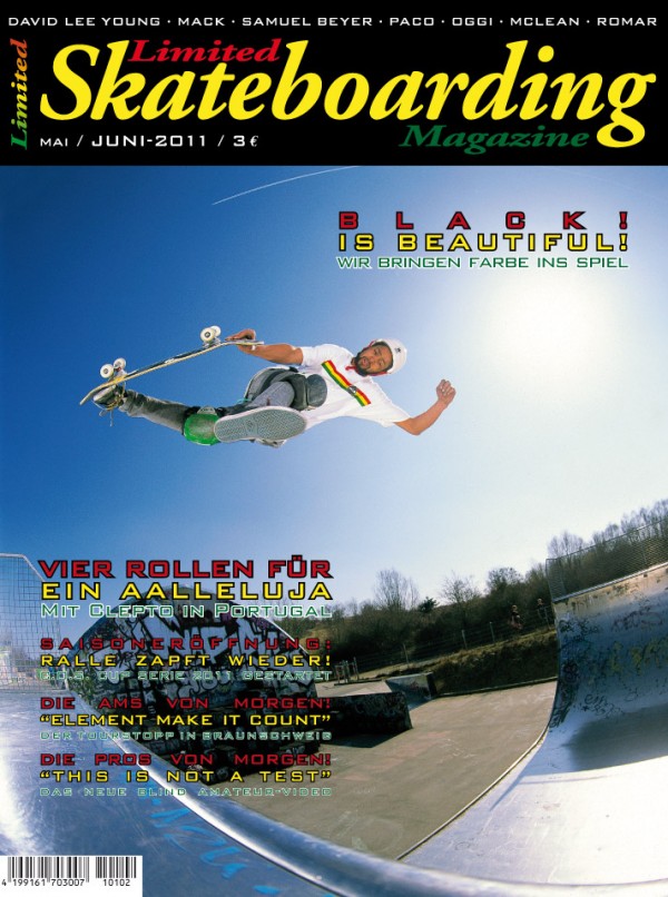 Es erwartet Euch ein Artikel der da „Black Is Beautiful“ heißt, wir waren mit den Jungs von Cleptomanicx in Portugal und zur Saisoneröffnung der COS-Cup-Serie in Bremen. Weiterhin haben wir den Tourstopp der „Element Make it count“ Serie in Braunschweig besucht und für Euch Bill Weiss und Ronnie Creager zu dem neu erscheinenden Blind-Amateur-Video „This is not a test“ ein paar Fragen gestellt.