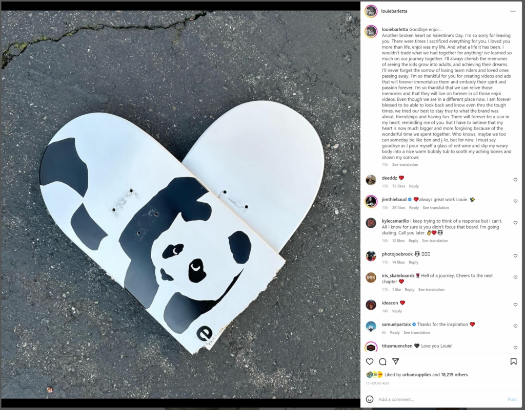 Gestern, pünktlich zum Valentinstag, erreichte uns nun von Louie Barletta, dem Mastermind hinter enjoi Skateboards, via Instagram die Nachricht, dass sich Louie und enjoi ebenfalls getrennt haben: