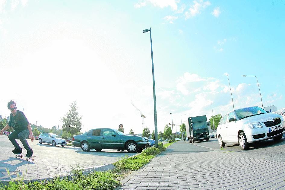 Es gibt da eine Fraktion aus Österreich, genauer gesagt aus Wien, die uns ganz besonders am Herzen liegt! Namentlich um Markus „Blacky“ Schwarz, Flo Erkinger und Axel Hallwirth! Blacky und Axel hatten schon Check-Outs im Limited, als die Meisten von Euch noch flüssig waren und beehren die deutschen Lande fast jedes Jahr mit einer kleinen „privaten Tour“. Im Sommer 2013 war das auch der Fall und Blacky im Rahmen dessen der Erste und Einzige, der bisher an meinem selbstgebauten „Kicker to über Bürgersteig“ Gap am Wiesbadener Schlachthof einen Trick machte!