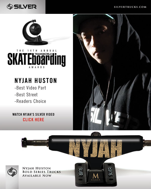 Bei den diesjährigen TWS Skate Awards hat Silver, Element und DC Shoes Pro Nyjah Huston gleich drei Titel eingeheimst. Best Video Part war von vorneherein klar, aber er hat auch die Rubriken Street und Reader’s Choice mit nach Hause genommen. Wen es interessiert: Ganz unten gibt es noch den ersten Teil der Interviews des roten Teppichs… hahaha. Oh Mann. Wenigstens ist Vodka Werbung im Hintergrund.