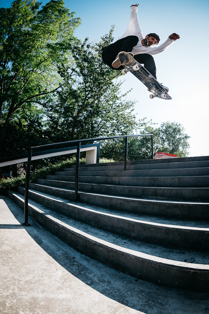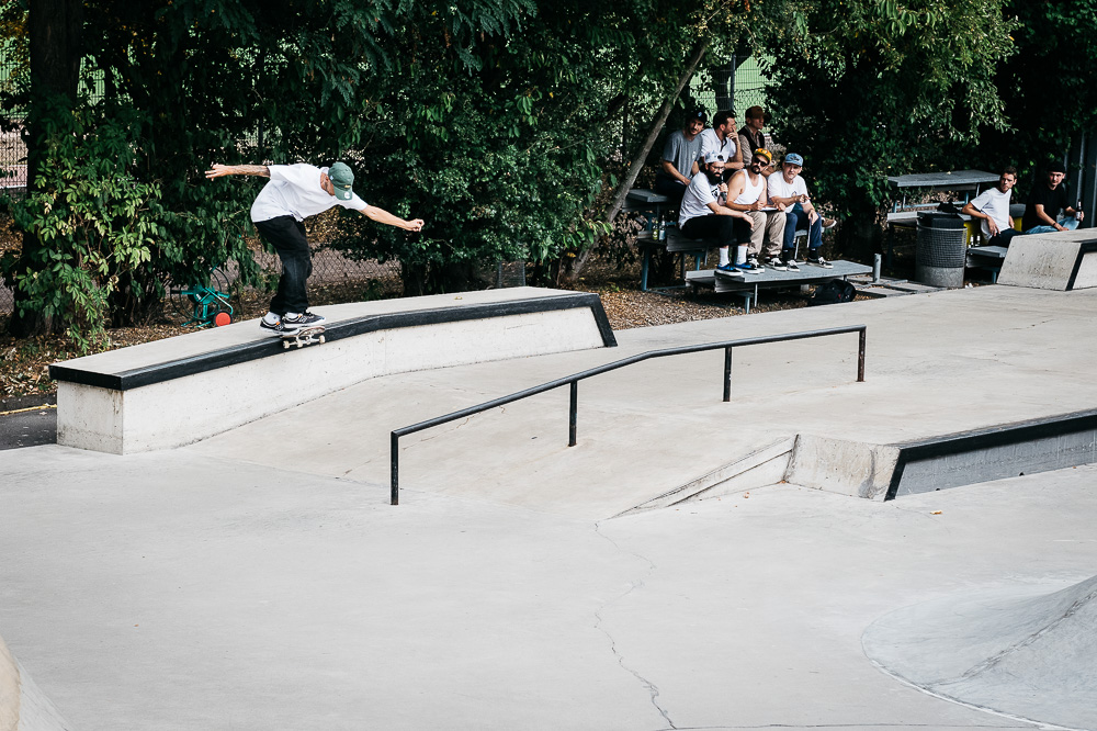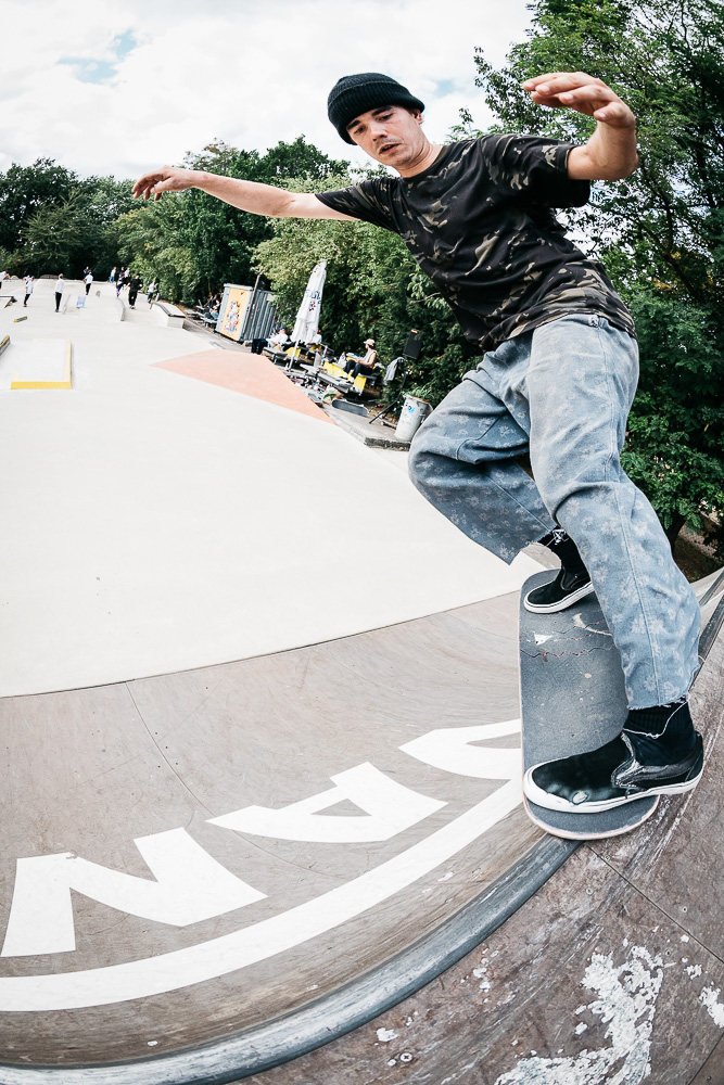 Bereits zu Beginn und vor dem Start des eigentlichen Contests ging bereits das Trickgeballer los. Die Wahl des Obstacles fiel hierbei nicht etwa auf die neuen, erst kürzlich enstandenen Slappy Curbs oder Vulcanos, sondern auf das Stufen-Set mit entsprechendem Rail – so wie sich das als Warm-Up gehört. Kurz die Einstellungen von der Kamera gecheckt und schon hatte Bartosz Ciesielski den ersten Bail kassiert, woraufhin nur die klare Ansage kam: „Der Nächste isses!“ – so war es dann auch. Nach einem kurzen aber heftigen Kampf konnte Bartosz bereits mit seinem persönlichen Sieg des Tages und einem fs Nosebluntslide, zum Frühstück sozusagen, den Contest beginnen.