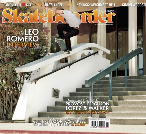 … oder Covershots, wie diesem hier des Skateboarder Mags mit Independent Pro Leo Romero, der an einem eigentlich abgenagten Spot, noch mal einen draufsetzt! Skateboarding kennt keine Grenzen.
